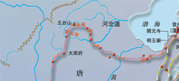 慈覚大師円仁 円仁は、838年から847年までの9年間にわたる中国での旅を、『入唐求法巡礼行記』に著した。これは全4巻、漢字7万字からなる世界的名紀行文である。仏教教義を求めて巡礼する日々の詳細を綴った記録は、同時に唐代の生活と文化、とりわけ一般庶民の状況を広く展望している。さらに842年から845年にかけて中国で起きた仏教弾圧の悲劇を目撃している。後に天台宗延暦寺の第三代座主となり、その死後、「慈覚大師」の諡号を授けられた