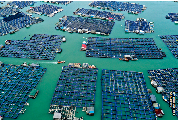 小舟が青い海面を進むと、養殖いかだや網いけすが波に合わせて上下に揺れる。唐さんは少し離れた新しいいかだを指し示して言う。