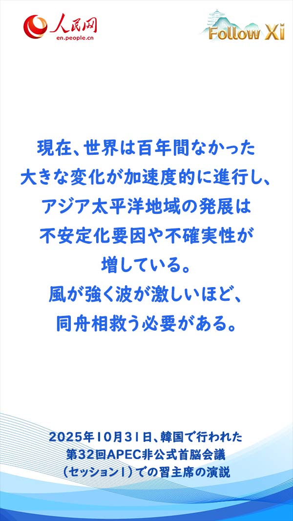 習主席は「APECは設立以来30年余り、アジア太平洋地域を世界の開放的発展の前列へと導き、アジア太平洋が世界経済で最も活力ある地域となる後押しをしてきた。現在、世界は百年間なかった大きな変化が加速度的に進行し、アジア太平洋地域の発展は不安定化要因や不確実性が増している。風が強く波が激しいほど、同舟相救う必要がある。各国は、経済成長の促進、人々の幸福の増進というAPECの初志を堅守し、開放的な発展の中での機会の共有、ウィンウィンの実現を堅持し、普遍的に恩恵をもたらす包摂的な経済のグローバル化を推し進め、アジア太平洋共同体を構築する必要がある」と指摘。