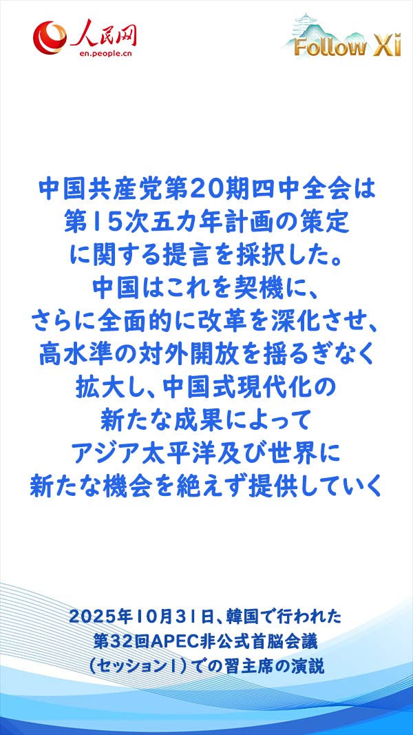 習主席はまた「中国は常に対外開放という基本国策を堅持し、実際の行動によって開放型世界経済の構築を後押ししている。中国共産党第20期中央委員会第4回全体会議(四中全会)は第15次五カ年計画(2026~30年)の策定に関する提言を採択した。中国はこれを契機に、さらに全面的に改革を深化させ、高水準の対外開放を揺るぎなく拡大し、中国式現代化の新たな成果によってアジア太平洋及び世界に新たな機会を絶えず提供していく」と強調した。(編集NA)